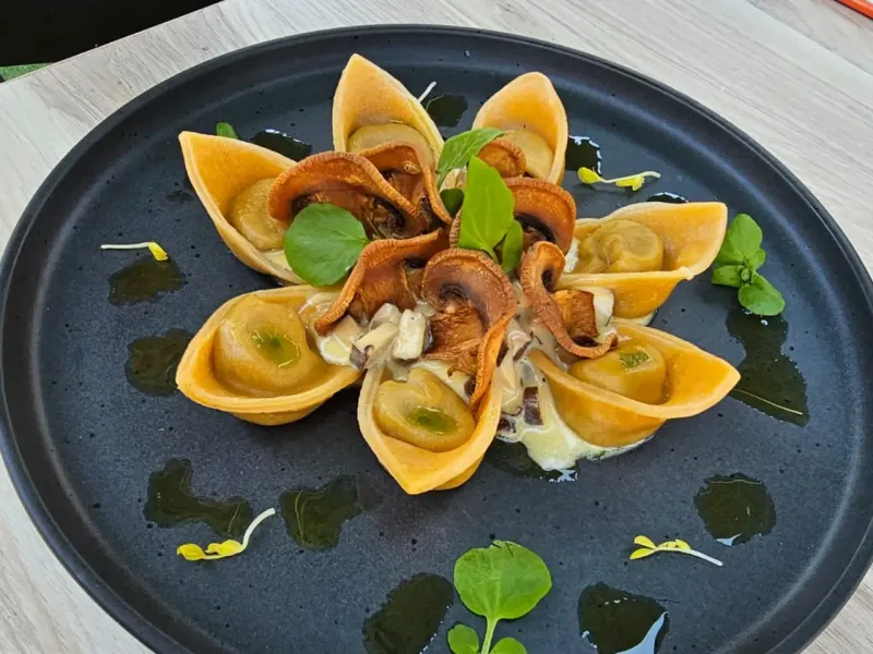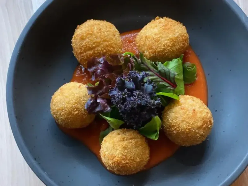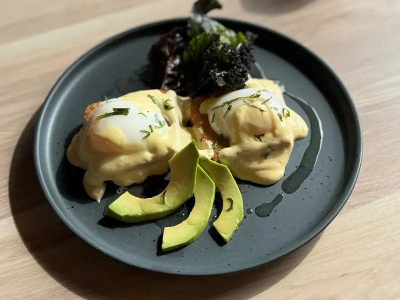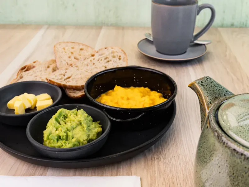 Causeo de huevos revueltos con tomate, queso fundido y pan de campo tostado. Todos vienen con café o té y un shot de jugo natural.