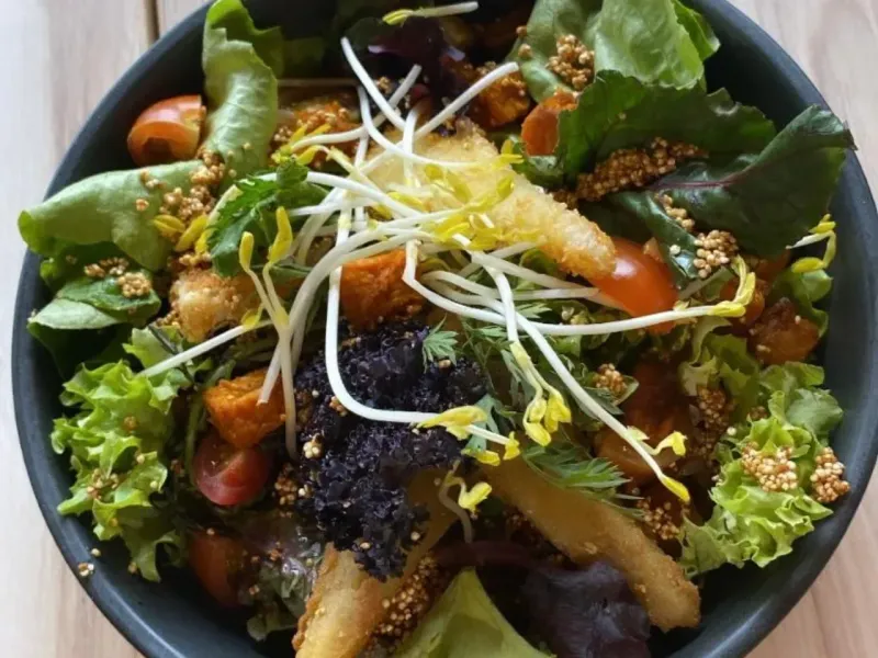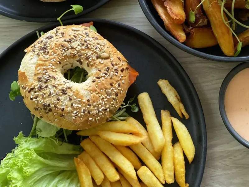 Pan Bagel, salmón ahumado, queso crema, berros hidropónicos y dressing limón oliva.